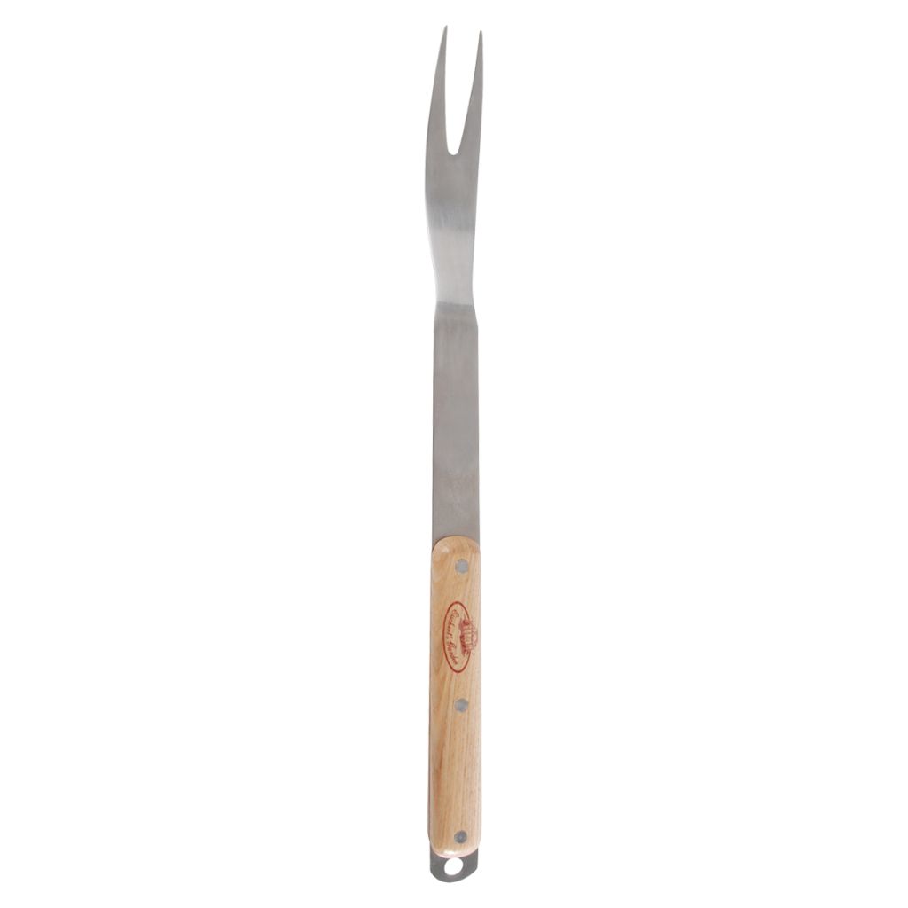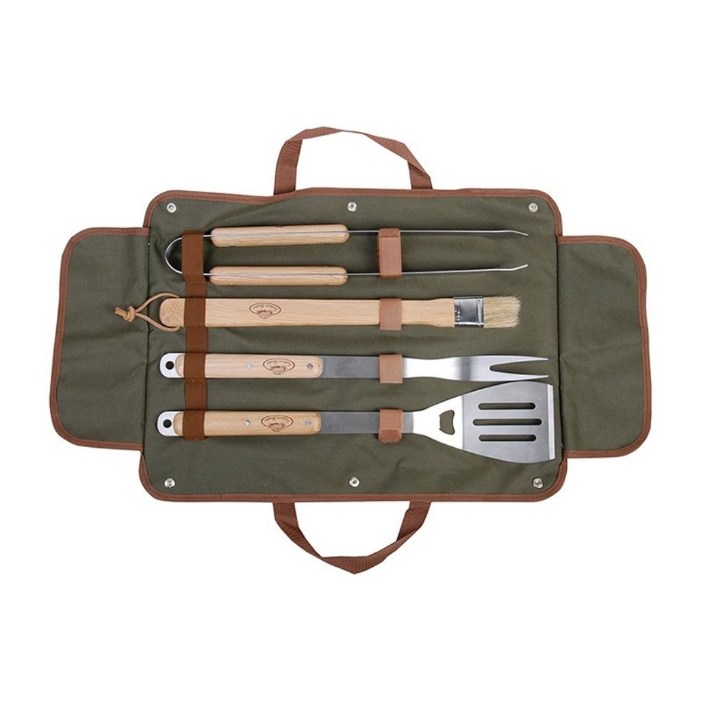 Det firedelte værktøjssæt i rustfrit stål med asketræs-håndtag består af grilltang, grillgaffel, spatel med flaskeåbner og BBQ-børste, alt sammen leveret i en foldepose, der nemt kan transporteres og sorteres.