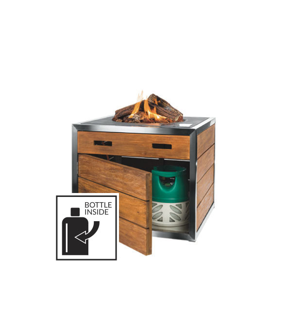 Happy Cocooning firkantet dining loungebord med pejs i teaktræ, stålkant og grå top.