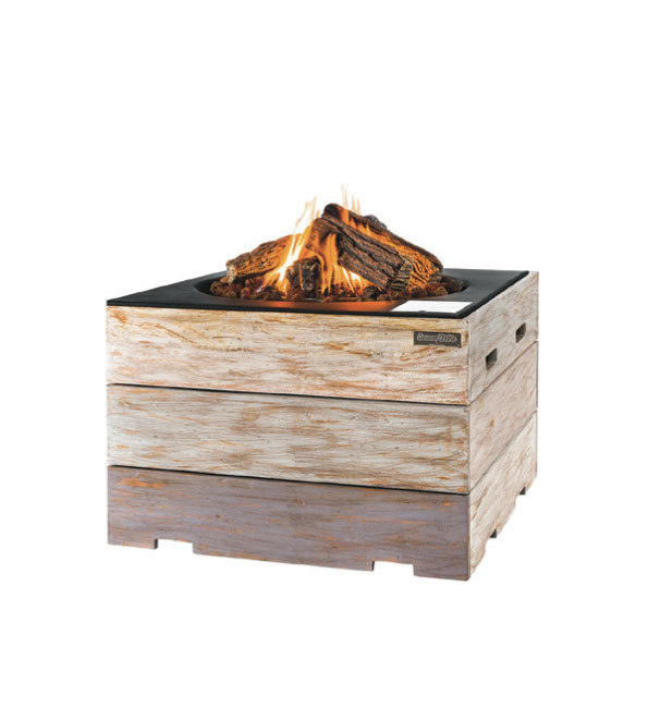Happy Cocooning Nice & Nasty firekantet loungebord med pejs i teaktræ med grå top.