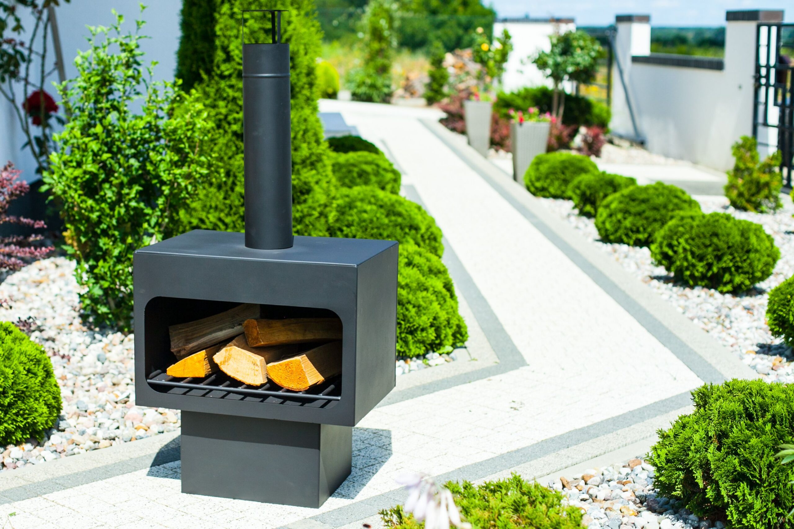 Hyggelig og flot udendørspejs med stort brændkammer. Udført i klassisk design i sort lakeret stål.