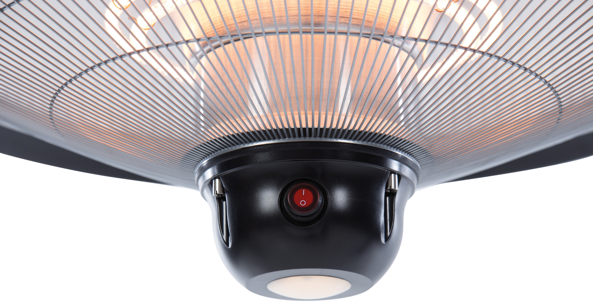 Elvarmeren her er nem at montere i loftet på en hvilken som helst terrasse, og så snart den er sat i stikkontakten skaber den varme, lys og skøn stemning. Du har mulighed for at indstille den på tre forskellige varmeniveauer: 900/1200/2100W enten manuelt via soft-touch knap eller ved hjælp af den medfølgende fjernbetjening. Her tændes også LED-lyset.